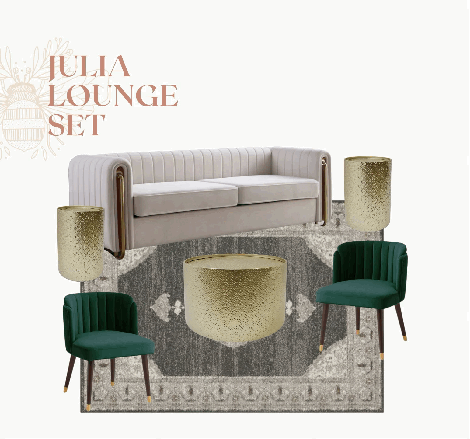 2 EMERALD VELVET CHAIRS BRASS COFFEE TABLE BRASS END TABLE PERSIAN RUG